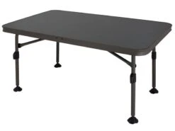 Een lichtgewicht maar zeer stabiele campingtafel. De tafel is heeft een glasfiber top met kunststof rand welke hittebestendig en watervast is. Het frame is van aluminium en de campingtafel is voorzien van voetjes met stabilisatoren zodat de tafel op iedere ondergrond stevig staat. Tevens zijn de poten in hoogte te verstellen (traploos): 44/59/72 cm.